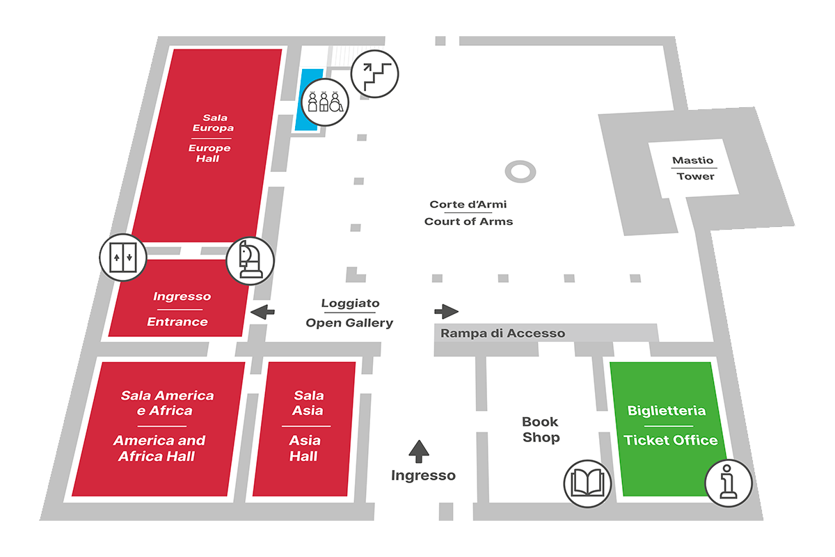 Varcato il portone d’ingresso subito, sulla destra, troviamo le due sale ospitanti l’Ufficio informazioni turistiche con la biglietteria e il bookshop.